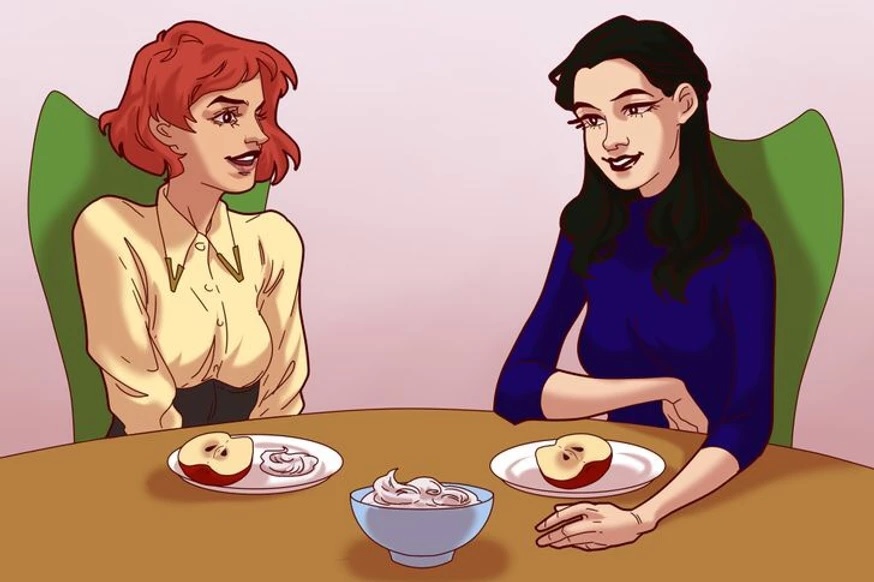 The host on the right invited her friend over for a delicious dinner. After indulging in a delectable starter and main course, she offered her a healthy dessert comprising of fresh apples.