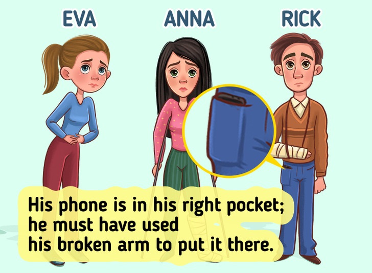 Rick is the liar! He claims his right arm is broken but his phone is resting in the right pocket of his jeans. He definitely wouldn’t put it there if he was unable to use his right arm.