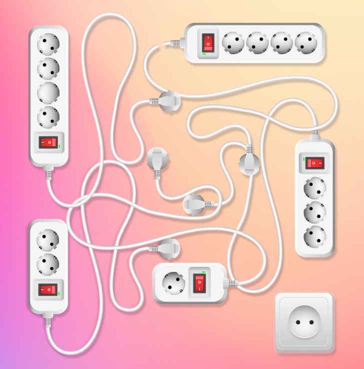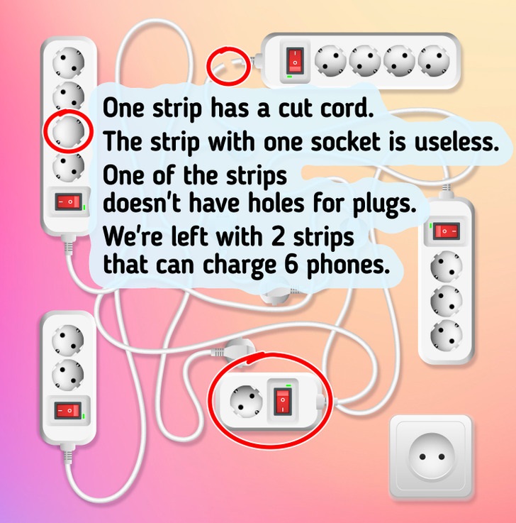In the picture, you can see five extension cords and one outlet. Your job is to figure out how many phones you can charge at the same time using the provided equipment.