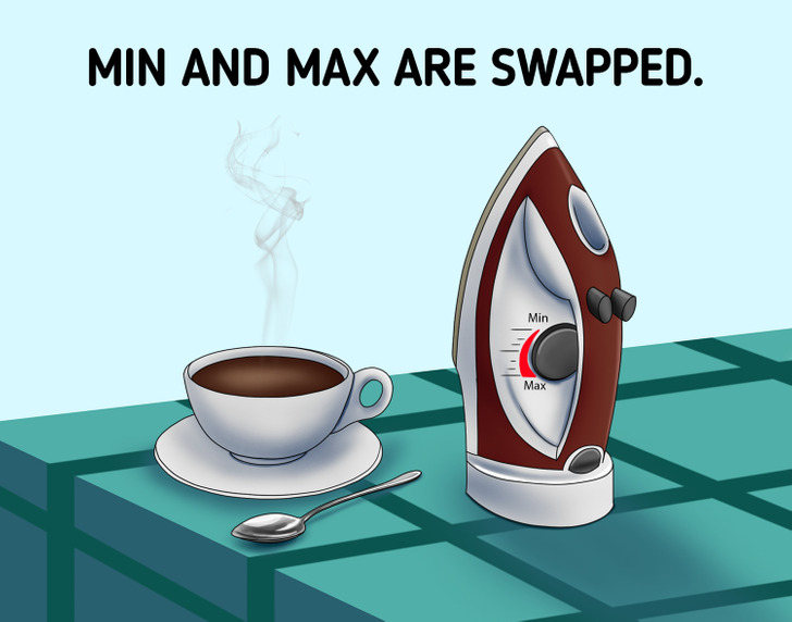 The picture shows a cup of hot coffee and a clothes iron next to it. There is also a teaspoon beside the cup. All three items were placed on a table covered in a blue cloth. But have you spotted the mistake yet?