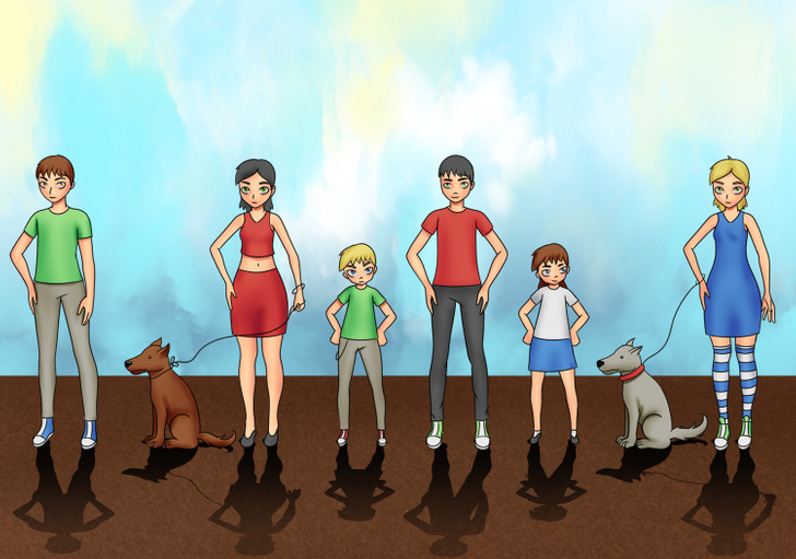 The picture shows people standing as if waiting for something. Two women arrived with their dogs. But there is a huge mistake in the image!