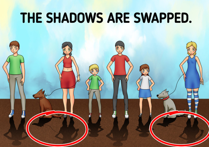 The image shows men, women, children and two dogs. But there is a mistake in the picture! Have you spotted it out yet?