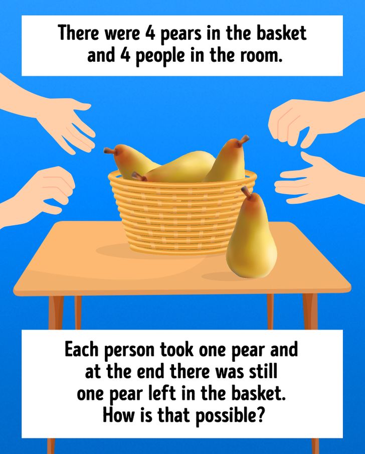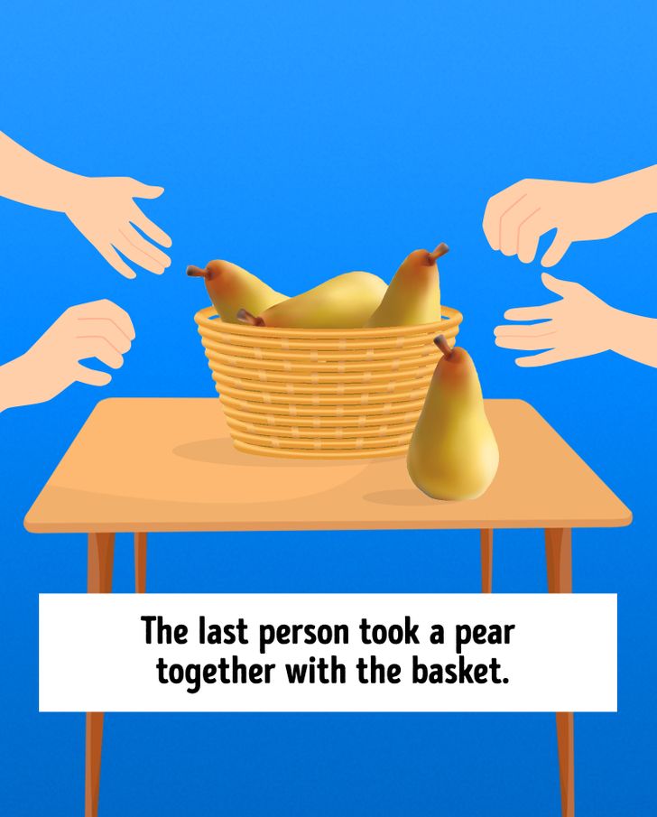 Since the last person took the pear and the basket too, it makes sense how there was just one pear left at the end of it all.