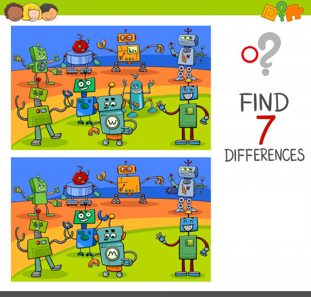2. Next, look at the missing eyes on the robot on the bottom right. 3. There’s a whole robot missing from one of the pictures. 4. Do you notice how the robot in the center has an upside-down W in one image and a W in the other? 5. The robot in the top left has a missing sign too.