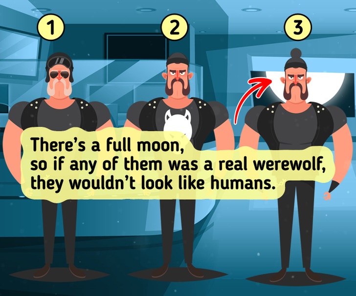 If you answered NONE, you’re correct! If any of them was really a werewolf he would shapeshift upon exposure to direct moonlight.
