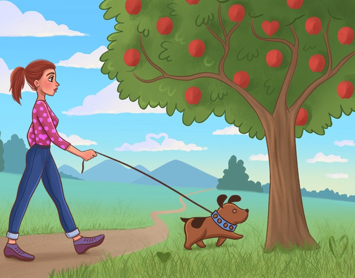 In the adorable countryside scene, you can see a woman walking her dog under a full apple tree. But can you see anything strange in there?