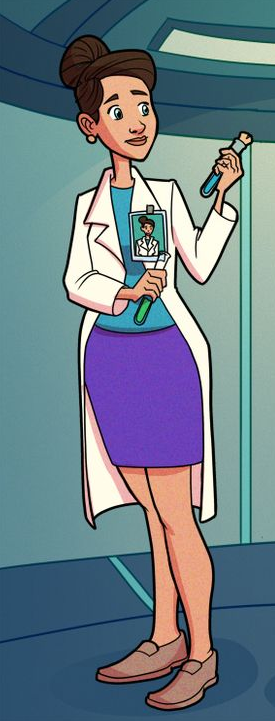 The first person is a female researcher wearing a white lab coat over her light blue top and purple skirt. She is looking at one of the test tubes in her hands.