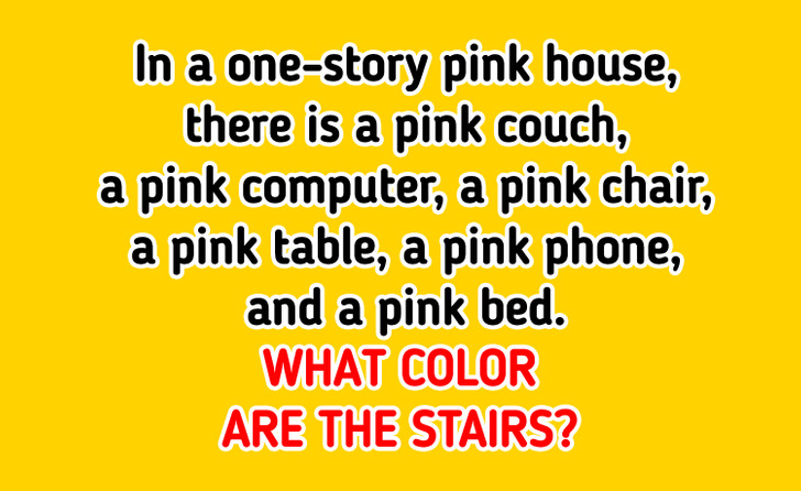 “In a one-story pink house, there is a pink couch, a pink computer, a pink chair, a pink table, a pink phone, and a pink bed. What color are the stairs?”