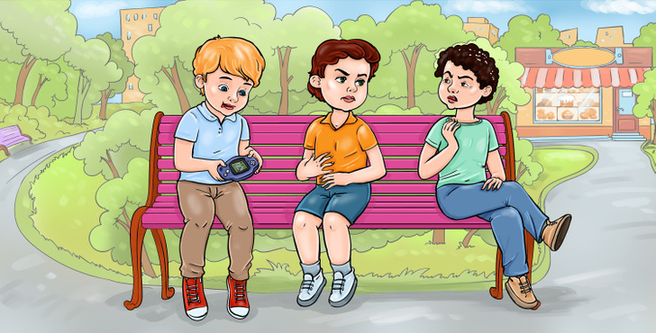 The picture shows three children sitting on a pink bench. Behind them are trees, a small park, and a bakery.