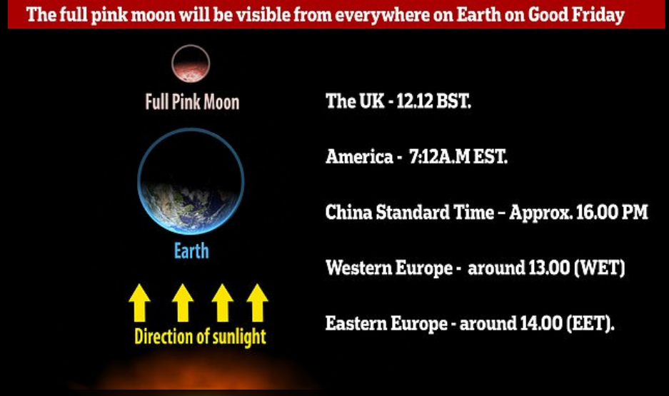 Thus, it can be daylight in some places when the pink moon comes up. Americans can witness the event while going to work because it will reach the zenith at 7:12am EST.