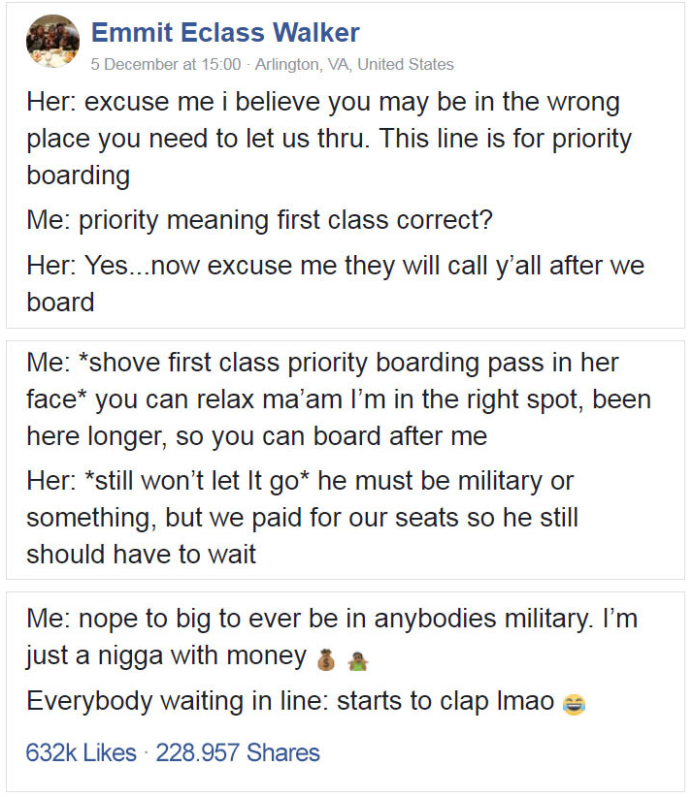 One day, Emmit was on an airport waiting in a ‘priority boarding’ line when a racist woman approached him with insensitive comments. Trying to cut in front of him, the fellow passenger told him to let her through, as she was, just by looking at him, confident that he doesn’t belong in the priority line.