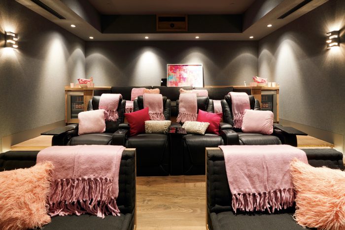 The beautiful pink house features two bedrooms, two bathrooms, and a fully-stocked kitchen. It also includes a movie theater, meditation area, sports court, infinity pool, hobby studio, and more!