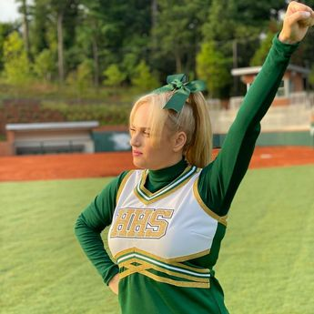 Rebel sported the cheerleading uniform, which she wears for the upcoming movie Senior Year.