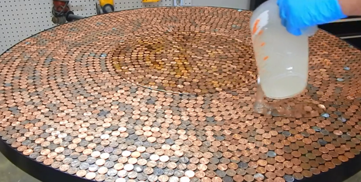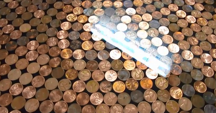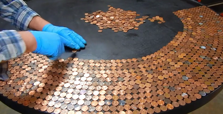 Also, go on the edges with some waste window blinds. Now paint the upper dark and lower in a lighter shade. Put on the pennies up till the center when the paint is ready.