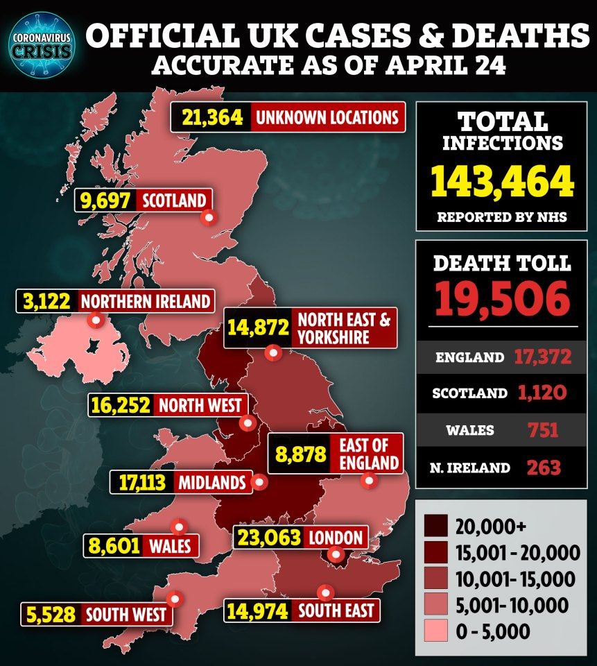Britain currently has 143,464 confirmed cases of the virus and the pandemic has claimed as much as 19,506 lives in the country so far.