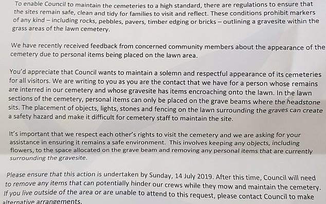 “Please ensure that this action is undertaken by Sunday, 14 July 2019. After this time, Council will need to remove any items that can potentially hinder out crews while they mow and maintain the cemetery.”