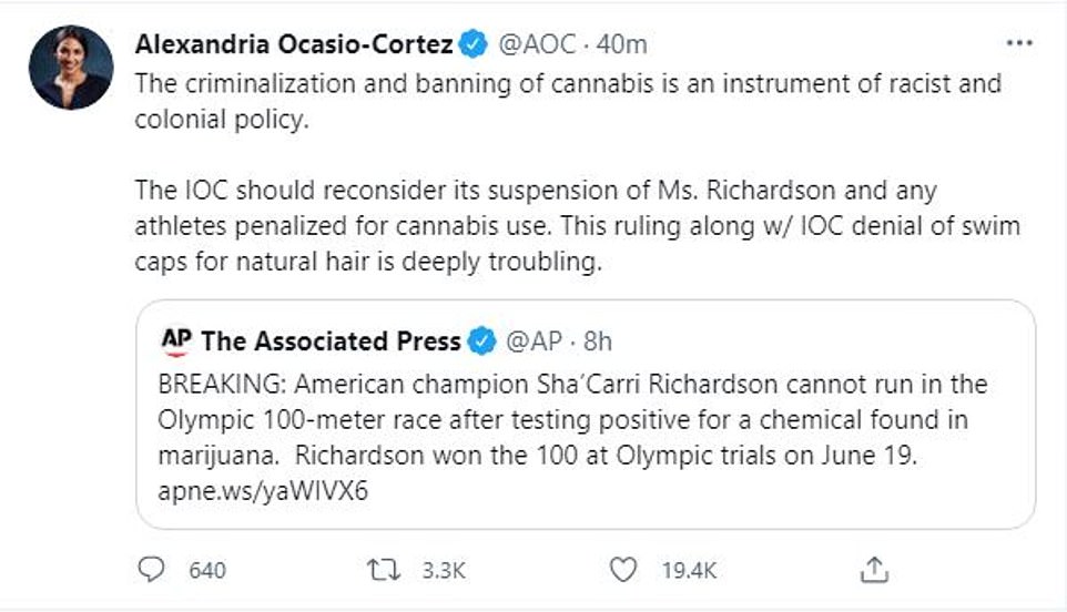 Alexandria Ocasio-Cortez was quick to slam the IOC for putting forward such a harsh stance against the country’s fastest sprinter after she failed her recent drug test. Richardson tested positive for marijuana and admitted to her mistake by sending a message via Twitter which explained how she is ‘only human’.