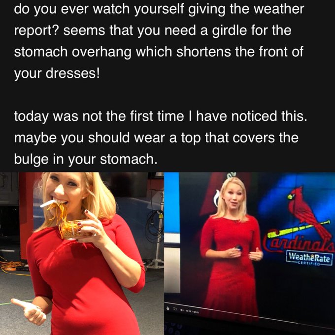 “Do you ever watch yourself giving the weather report? Seems that you need a girdle for the stomach overhang which shorted the front of your dresses!