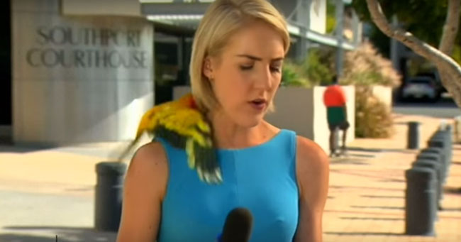 A friendly parrot landed on her shoulder when Brittney was delivering a big report while standing in front of the camera.