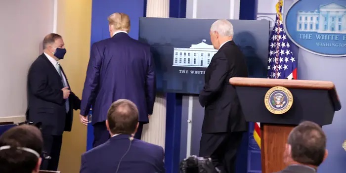 After congratulating “the people of our country” and thanking everyone, Trump made a hasty getaway, prompting puzzled reporters to verbally express their confusion.