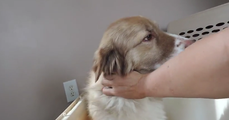The dog was scared and kept hiding behind the crate. But Bernard patiently inched forward and began to slowly caress the pup. Eventually, the dog sat at the bottom of the crate where he spends the next 45 minutes.