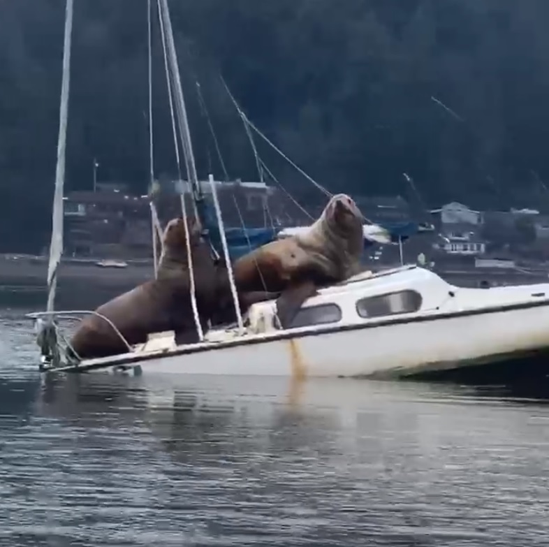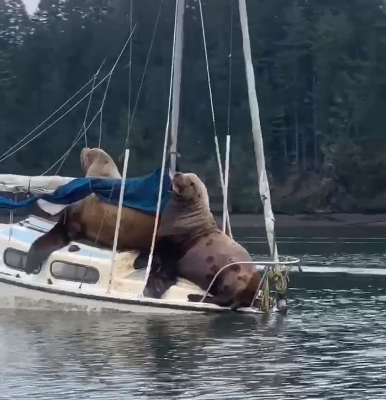 While it isn’t clear who the owner of the boat is, it is definitely unusual to see two giant sea lions casually relaxing on such a small vessel.