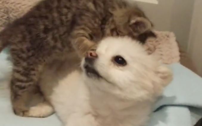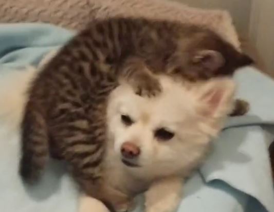 Dogs are just patient enough to handle the little, mean cat. We have also seen videos of dogs and cats when they are fighting like siblings. The cutest is when they are taking care of the cats like they are the children or when the cat is curious about the dog.