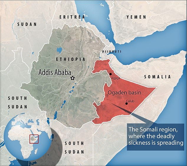 The unknown sickness has been blamed on toxic waste from Chinese oil drilling and has allegedly spread through villages near the project in Somali.