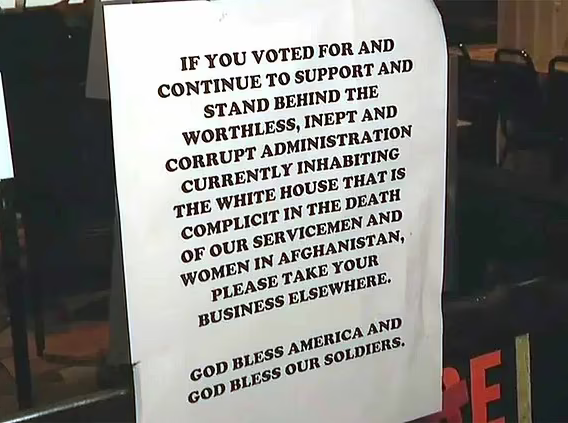 The post reads: “If you voted for and continued to support and stand behind the worthless, inept and corrupt administration currently inhabiting the White House that is complicit in the death of our servicemen and women in Afghanistan, please take your business elsewhere.”