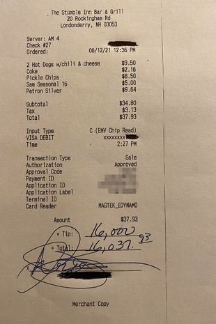 A kindhearted diner had been enjoying his meal at Stumble Inn Barr & Grill in Londonderry, New Hampshire when he left a waitress dumbfounded.