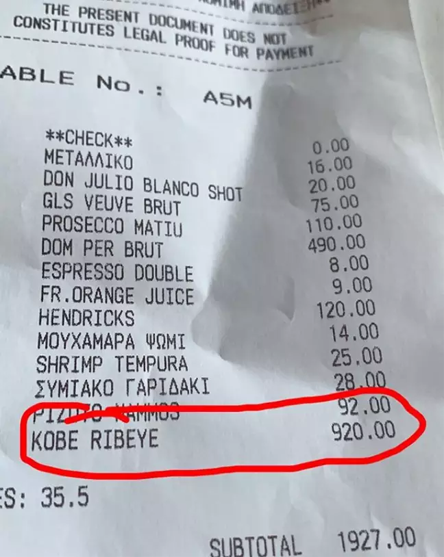 Having a close look, one can tell that the steak was not the only pricey thing on the menu that he enjoyed. The total bill was an astronomical $2,135 (€1927).