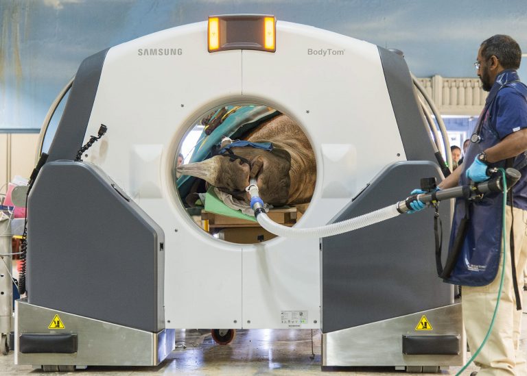 Watch the enormous rhino getting a CAT scan before undergoing surgery