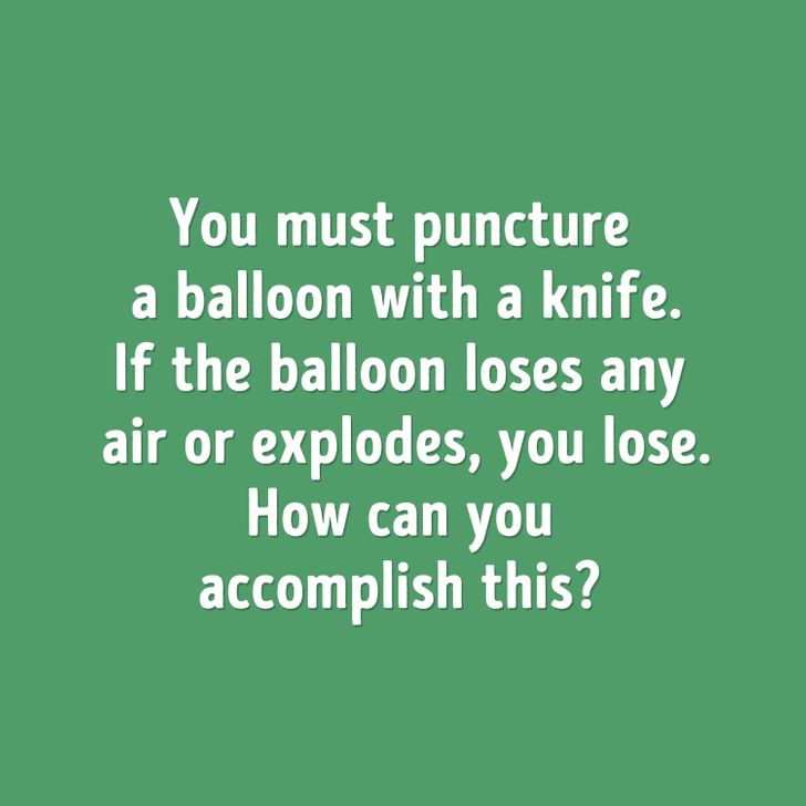 “You must puncture a balloon with a knife. If a balloon loses any air or explodes, you lose. How can you accomplish this?”