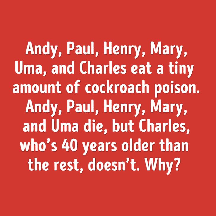 “Andy, Paul, Henry, Mary, Uma, and Charles eat a tiny amount of cockroach poison. Andy Paul, Henry, and Uma die, but Charles, who’s 40 years older than the rest, doesn’t. Why?”