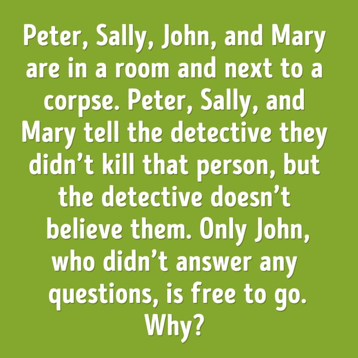 “Peter, Sally, John, and Mary are in a room and next to a corpse. Peter, Sally, and Mary tell the detective they didn’t kill that person, but the detective doesn’t believe them. Only John, who didn’t answer any questions, is free to go. Why?”