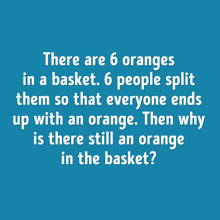 “There are 6 oranges in a basket. 6 people split them so that everyone ends up with an orange. Then why is there still an orange in the basket?”