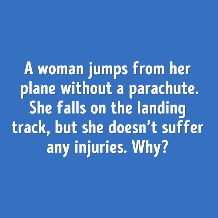 “A woman jumps from her plane without a parachute. She falls on the landing track, but she doesn’t suffer any injuries. Why?”