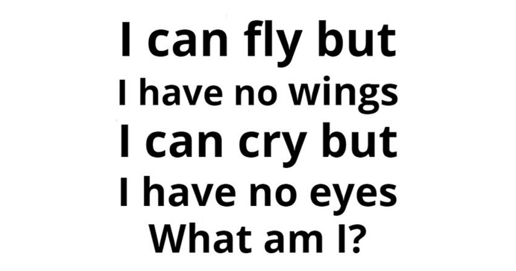 Ready? The riddle goes like this: “I can fly but I have no wings. I can cry but I have no eyes. What am I?” People have already given a lot of guesses, but most of them are wrong. As usual, there will be hints along the way, but can you figure it out without the hints? Or will you be able to solve it as quick as lightning?