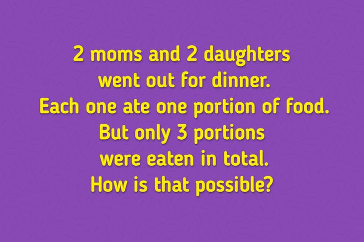 “2 moms and 2 daughters went out for dinner. Each one ate one portion of food. But only 3 portions were eaten in total. How is that possible?”