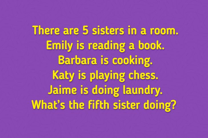 “There are 5 sisters in a room. Emily is reading a book. Barbara is cooking. Katy is playing chess. Jaime is doing laundry. What’s the fifth sister doing?”
