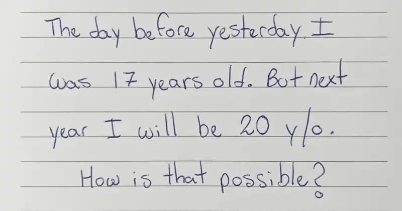 Your job is to figure out how it is possible for a person to be 17 years old the day before yesterday and then 20 the next year.