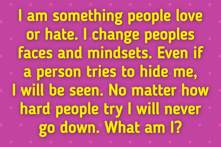 “I am something people love or hate. I change people’s faces and mindsets. Even if a person tries to hide me, I will be seen. No matter how hard people try I will never go down. What am I?”