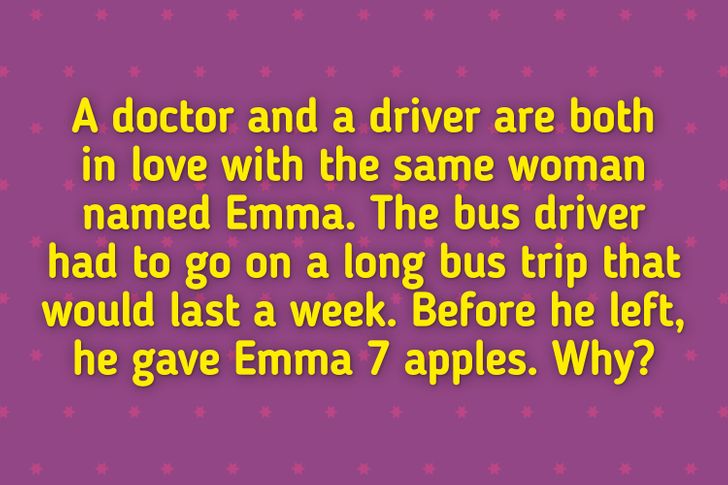 “A doctor and a driver are both in love with the same woman named Emma. The bus driver had to go on a long bus trip that would last a week. Before he left, he gave Emma 7 apples. Why?”