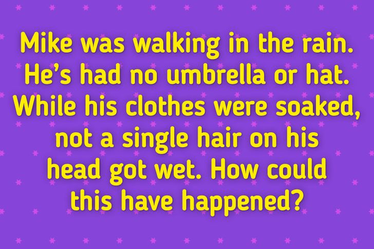“Mike was walking in the rain. He’s had no umbrella or hat. While his clothes were soaked, not a single hair on his head got wet. How could this have happened?”