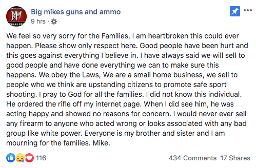 “I would never ever sell any firearm to anyone who acted wrong or looks associated with any bad group like white power. Everyone is my brother and sister and I am mourning for the families.”