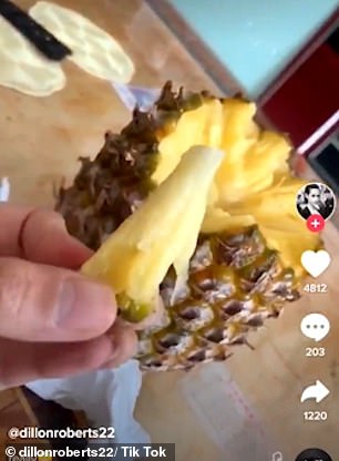 TikTok by user Dillon Roberts shows someone pulling pineapple pieces from the outside after chopping off the top.