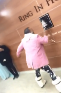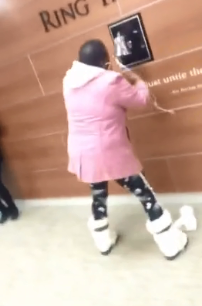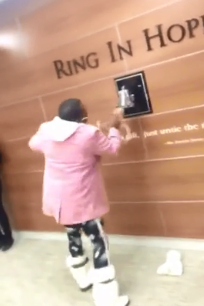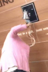 This woman who was in the hospital fighting her cancer is bursting out with happiness today as she has finally defeated cancer and so she is ringing the Bell of Hope in the hospital.