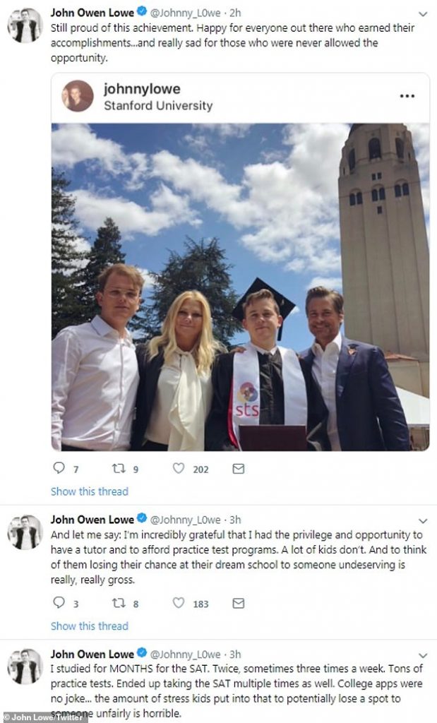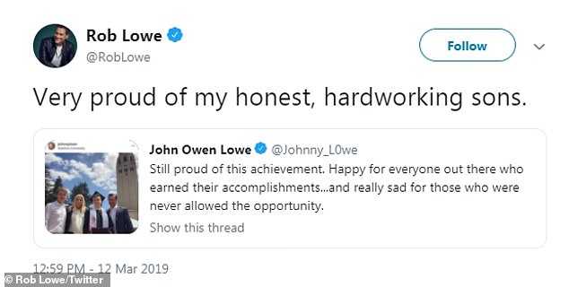 On Tuesday, Rob Lowe was among the stars who commented publicly on the news while defending the achievements of his own college-educated kids.