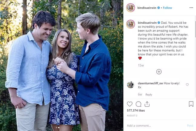 Bindi has also revealed she asked her 15-year-old brother to walk her down the aisle since her father won’t be there to do it.