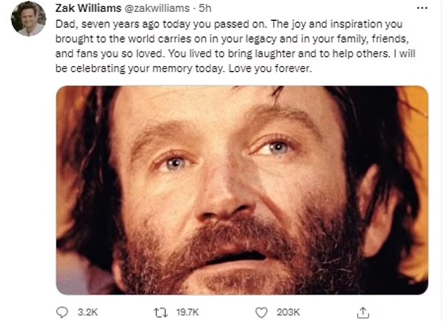Zak Williams, the son of late legend Robin Williams, has paid a touching tribute to his father on his 7th death anniversary.